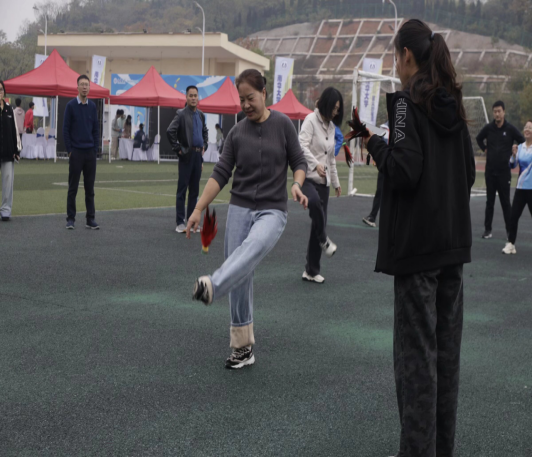 “妙笔生花” 踢毽子比赛同样精彩。彩色毽子在选手脚尖、膝盖、肩头间流转,划出一道道灵动的弧线。甘斐哲、邹梦琴等老师身姿矫健,只见她左脚轻抬将毽子掂起,右腿顺势接踢,毽子在空中翻转两周后精准落回脚尖,整套动作行云流水,赢得观众阵阵喝彩。