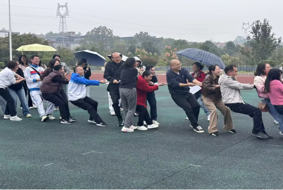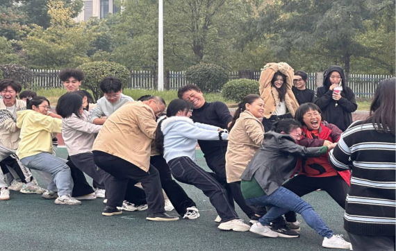 压轴登场的 “力拔山河” 师生同心拔河友谊赛,更是将团结的力量展现得淋漓尽致。各支队伍师生齐心协力,大家双脚蹬地、身体后倾,紧握长绳的双手因发力而指节发白。裁判哨声一响,双方立刻陷入僵持,绳子中间的红绸带在中线两侧来回移动。“中文系,加油!”“老师们,使劲!” 场边的助威声震耳欲聋,连平日里文静的女生都踮着脚呐喊。当红绸带终于越过己方界线,队员们瞬间瘫坐在地,却不忘拉起对手的手,汗水浸透的脸上满是畅快的笑容。