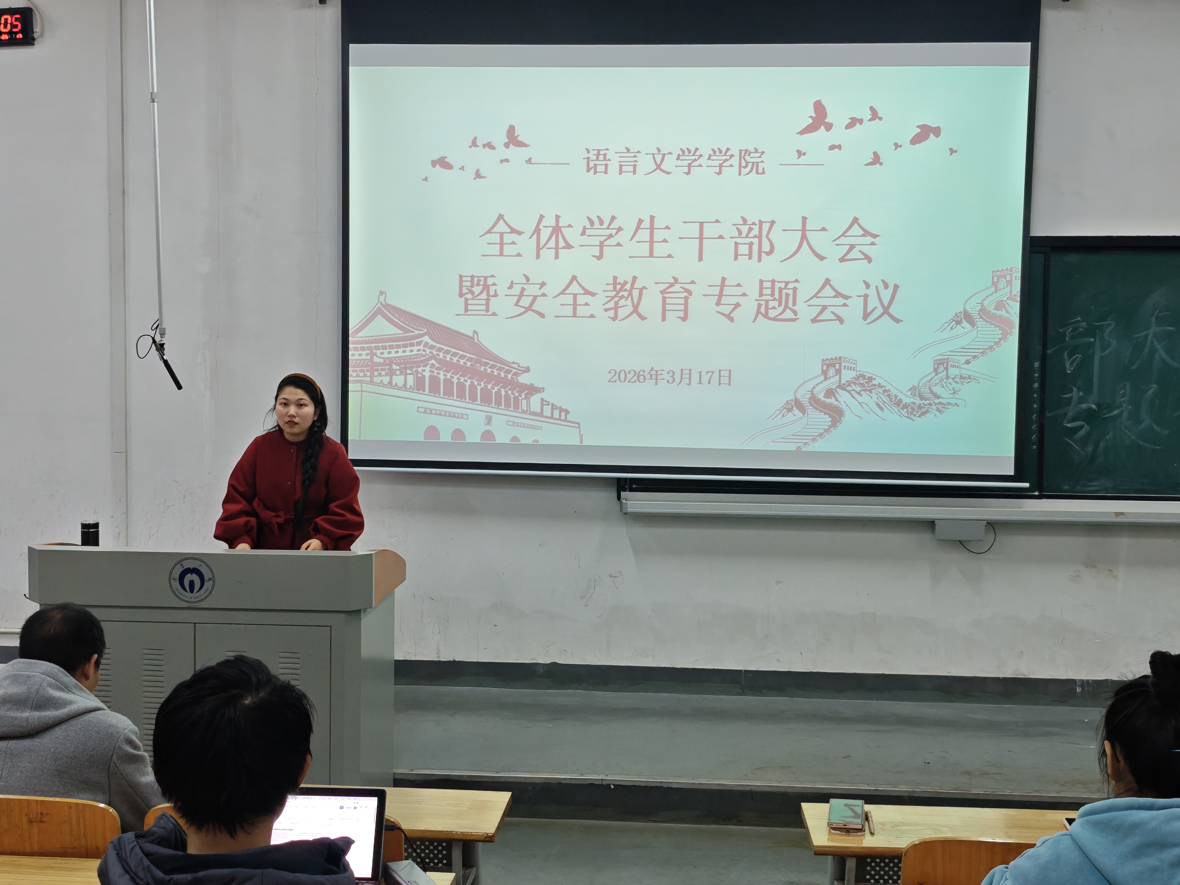 3月17日中午,语言文学学院在雨母楼111教室召开新学期全体学生干部大会暨安全教育专题会议。学院党委副书记周艳玲、全体学工办老师及学院全体学生干部参会,学院团委书记肖玲慧主持会议。
