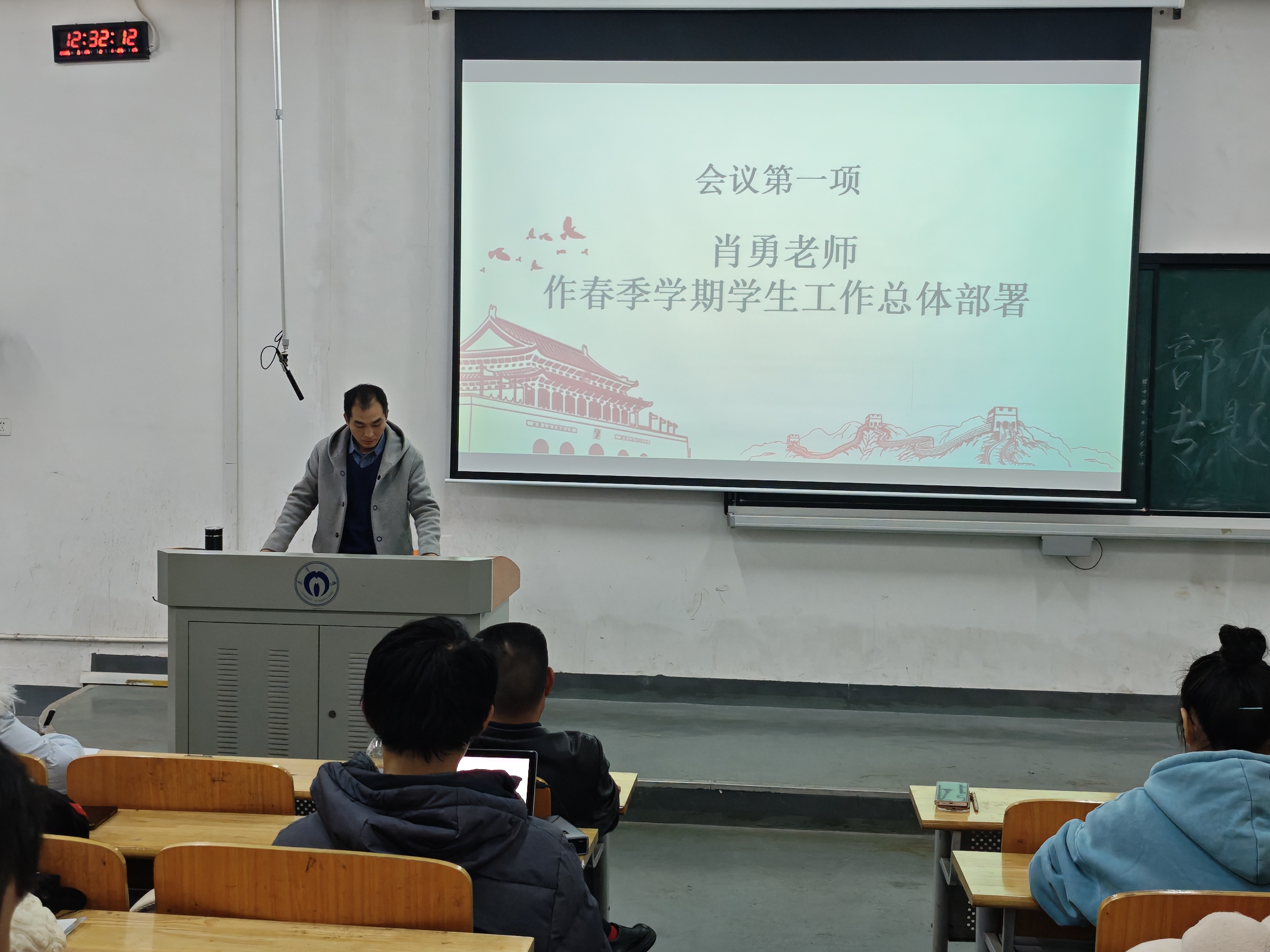会议伊始,学工室主任肖勇围绕新学期学生工作进行总体安排,部署本学期重点任务与工作节奏,进一步细化责任分工,为新学期团学工作有序开展划定清晰方向。辅导员王冰灵结合学风建设、日常管理与劳动教育作出具体部署,引导全体学生强化自律意识,端正学习态度,在实践与劳动中锤炼品格、涵养优良作风。辅导员刘奇峰针对资助育人与国防教育强调要精准落实各项资助政策,切实做好帮扶工作,同时要加强国防教育宣传,增强青年学子国防观念与爱国意识,厚植家国情怀。