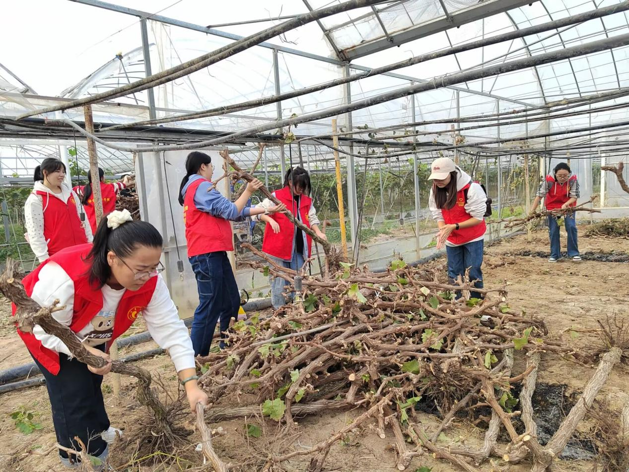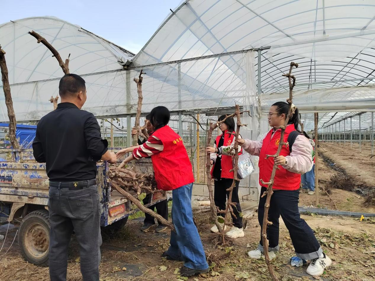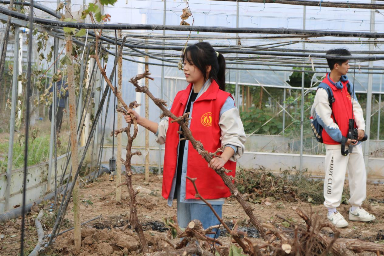 清晨,暖阳洒满乡野,抵达实践地点后,学子们迅速投入劳动。在村民的示范指导下,葡萄种植大棚内率先响起劳动的声响,学生们分工协作,手持工具弯腰穿梭于葡萄藤架下,仔细清理棚内残留的树枝,指尖沾染泥土却毫不在意,默契配合间,原本杂乱的棚内很快变得整洁有序。
