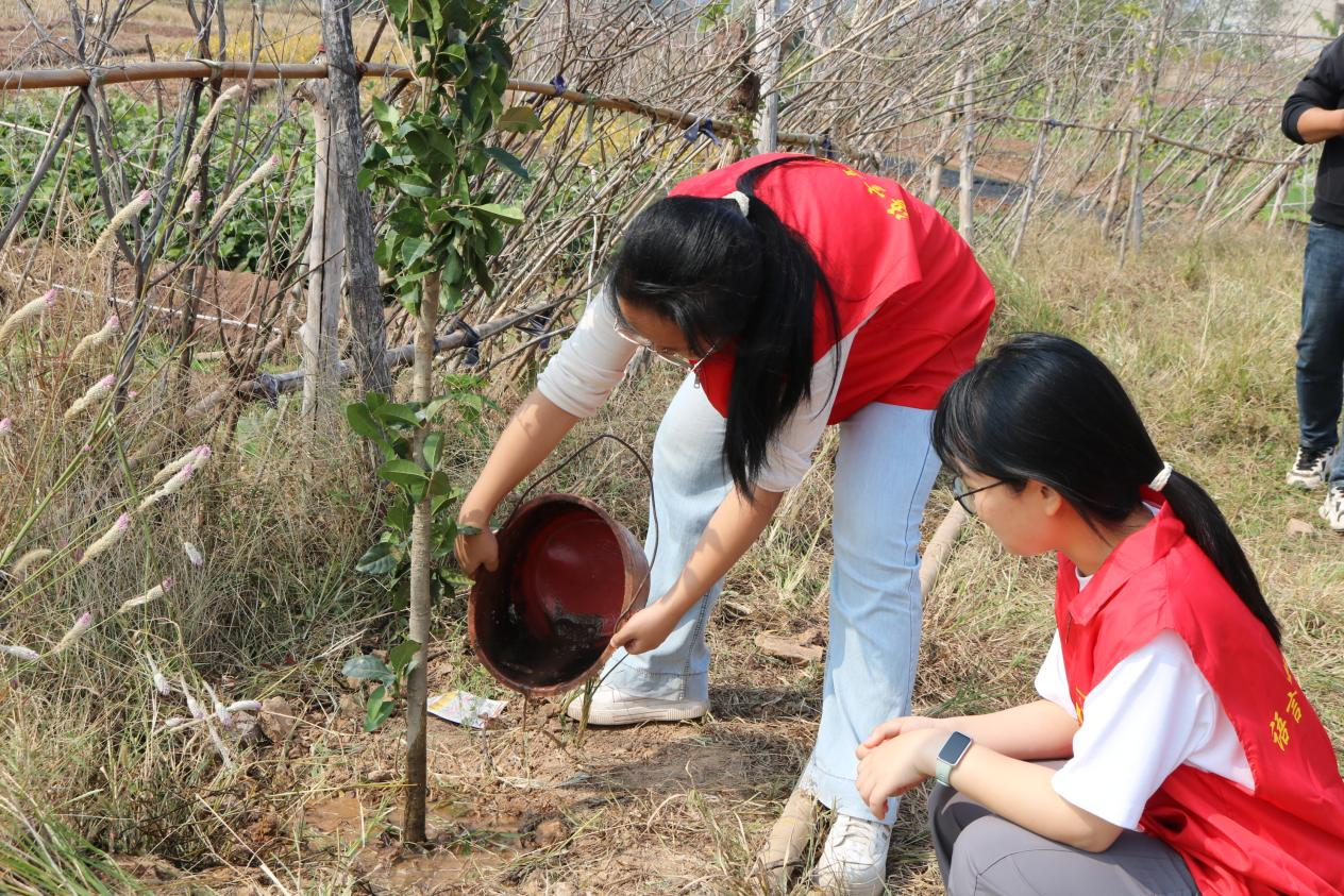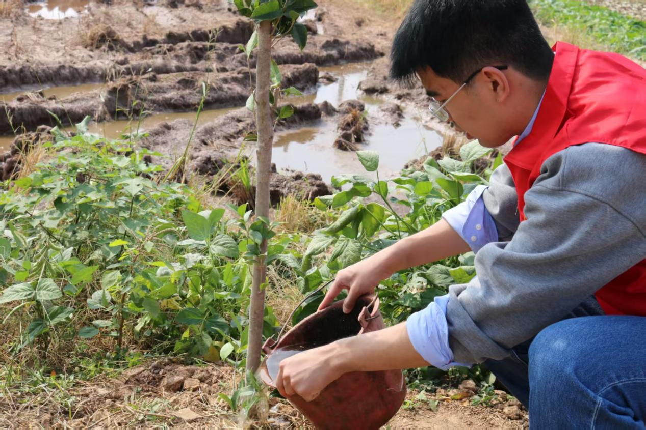 随后,在村书记的带领下,学子们两人一组,开启植树环节:同学们或挥锹挖坑,把握深度;或小心扶苗,确保直立;或填土压实,筑牢根基。微风轻拂,新栽的幼苗轻轻摇曳,学子们脸上洋溢着喜悦。
