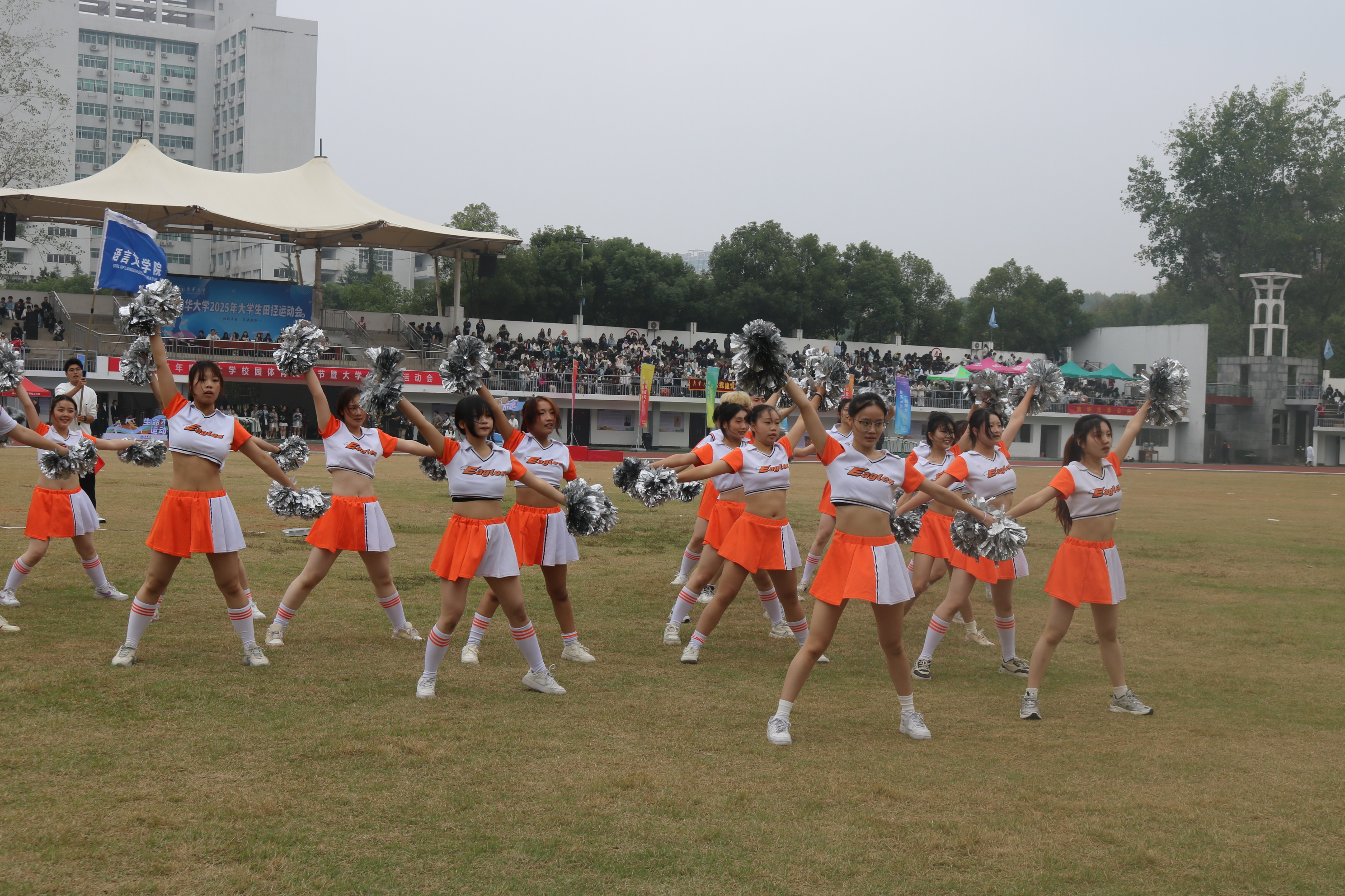 随着动感十足的音乐响起,啦啦操队员们身着橙白色队服,手持绚丽的花球,以自信的笑容和矫健的步伐闪亮登场。她们的动作整齐划一,干净利落,在富有节奏感的旋律中,跳跃旋转等一系列技巧动作衔接流畅,赢得了全场喝彩,展现了青春的活力与激情,将体育精神与人文气息完美结合,为激烈的赛场注入了一股清新而灵动的艺术之风。