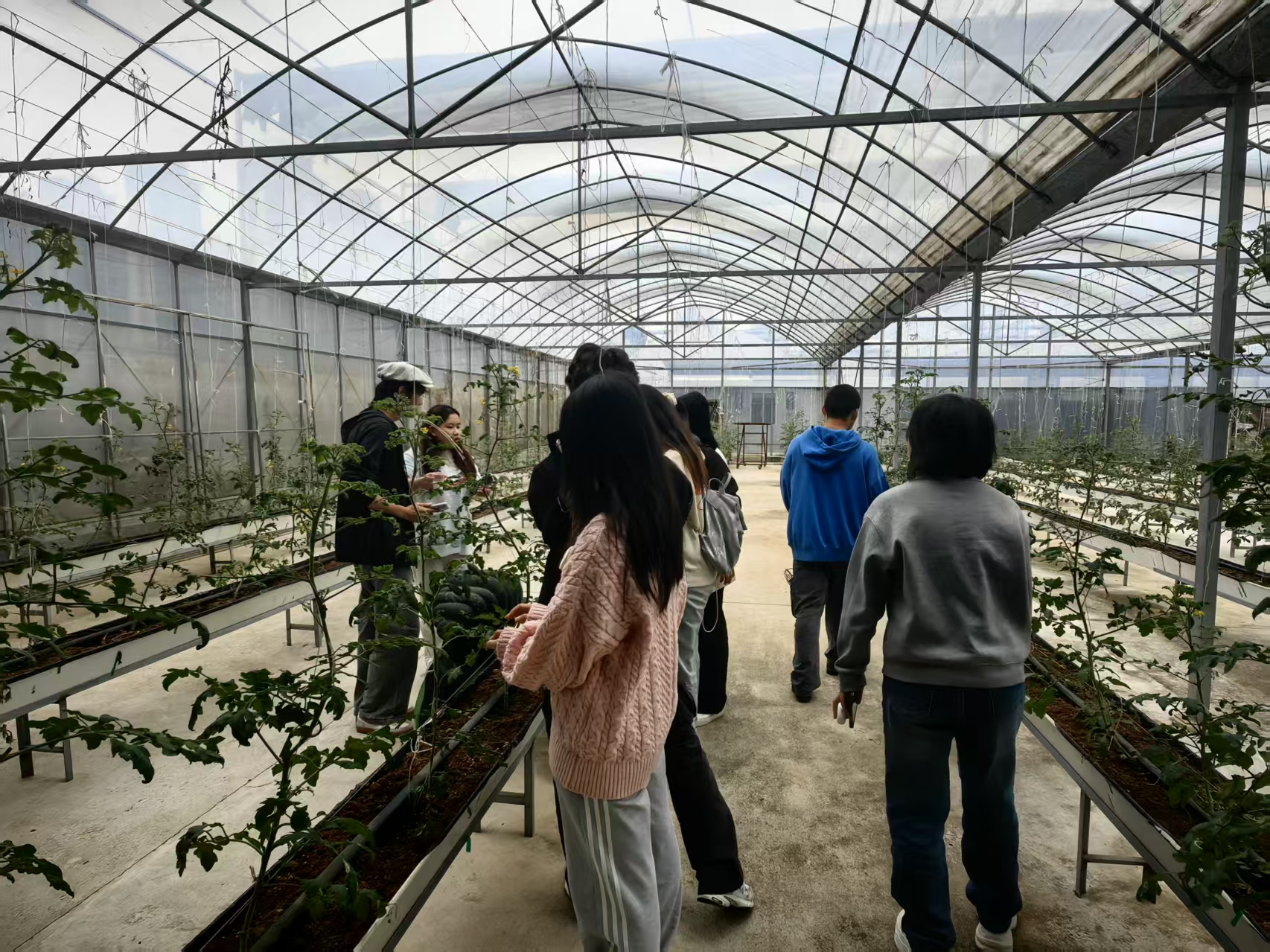 在基地工作人员引导下,师生们先走进现代农业示范园区。番薯田绿意盎然,而基质栽培区更令人瞩目:椰糠、泥炭等基质替代土壤,滴灌系统与温控设施精准调控生长条件,蔬菜在栽培架上蓬勃生长。这堂鲜活的“田间课”,让大家直观感受科技创新对农业的推动作用,深化了对“藏粮于地、藏粮于技”战略的理解。