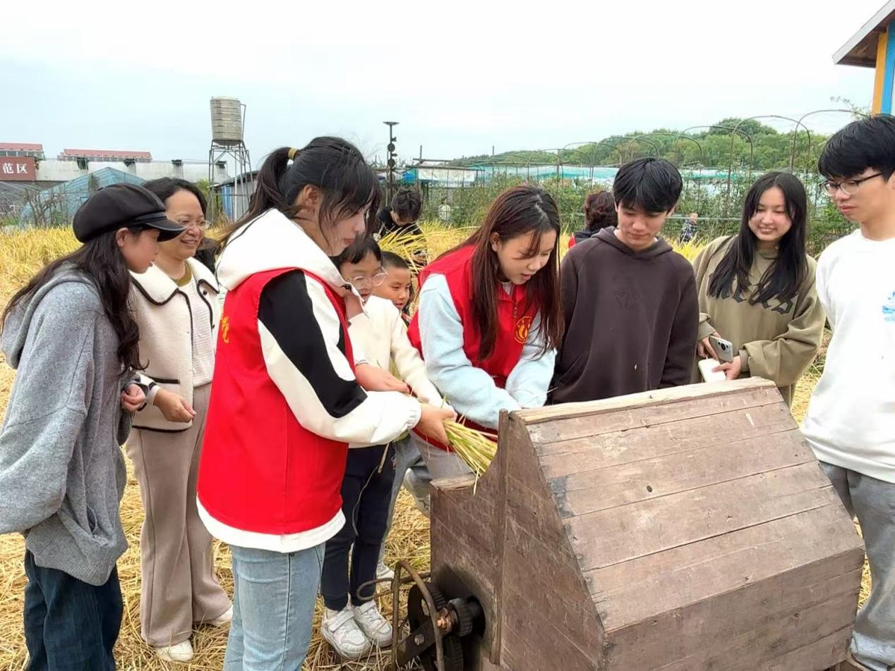实践环节中,金色稻田里热闹非凡。师生们挽裤握镰,在农技人员指导下学习收割,弯腰、挥镰间,汗水滴落田垄,真切体会到“粒粒皆辛苦”的重量,对粮食安全有了更具象的认知。随后的传统农事体验区,石磨转动间黄豆化为乳白浆液,师生轮流协作,在磨砺耐心中领悟“幸福源于奋斗”的深意。