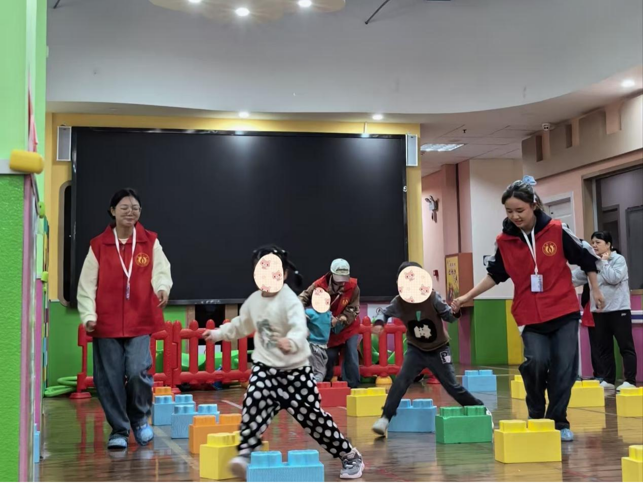 互动课程上,小小的凳子化作趣味障碍赛的道具,孩子们灵活穿梭其间,脸上洋溢着笑容;老鹰捉小鸡游戏中,志愿者们化身“鸡妈妈”“老鹰”,与孩子们尽情奔跑嬉戏,追逐声、欢呼声汇成最动听的旋律。