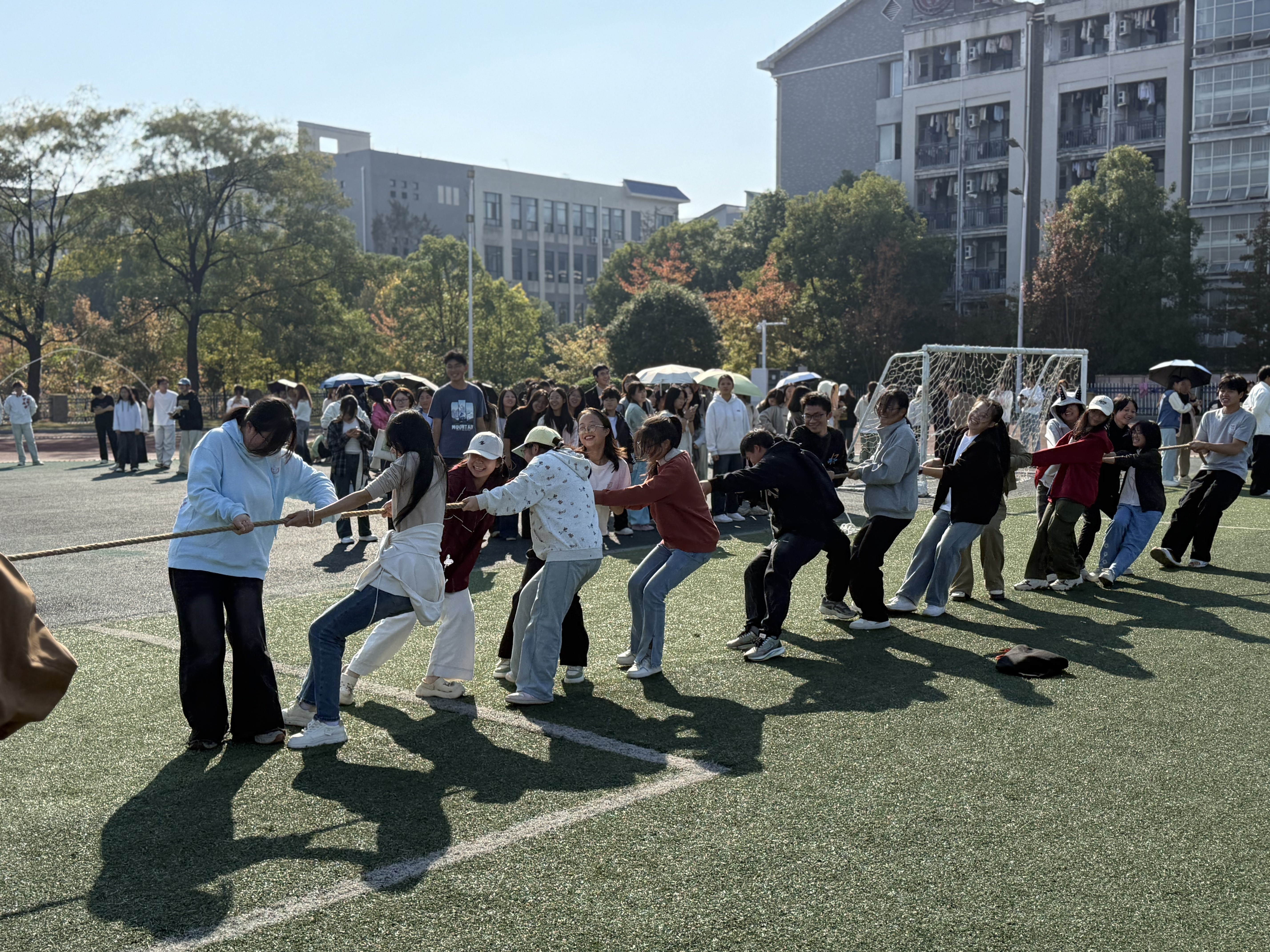 活动现场,各类趣味项目接连上演:集体跳大绳时,大家目光同向、脚步同频,绳影翻飞间,展现出极强的团队凝聚力;踢毽子接力环节,选手们屏气凝神、灵活腾挪,彩色毽子在脚尖轻盈跳跃;拔河比赛更是将气氛推向高潮,参赛同学紧握长绳、重心下沉,脸庞因用力而涨红,朝着同一方向奋力后拉,场外助威声震耳欲聋,尽显少年人不服输的韧劲;盲人方阵挑战中,大家褪去迟疑,凭着信任与沟通相互指引,用默契搭建起坚实的“同心阵”。