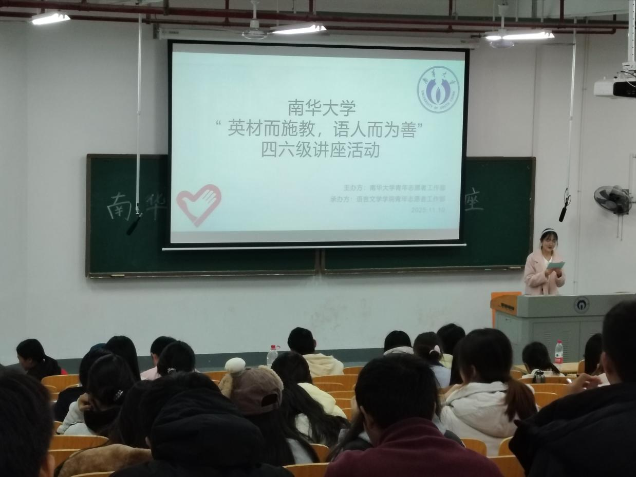 时序近冬,四六级考试的号角渐响。为助雨母校区的同学们筑牢备考底气,近日,由语言文学学院主办的南华大学“英材施教,语人而为善”四六级讲座活动在雨母楼教室顺利启幕,活动特邀英语2301班占周飞、翻译2301班谢世情、英语2206班谢均云及英语2302班邓婵担任主讲,为同学们带来干货满满的备考指导。
