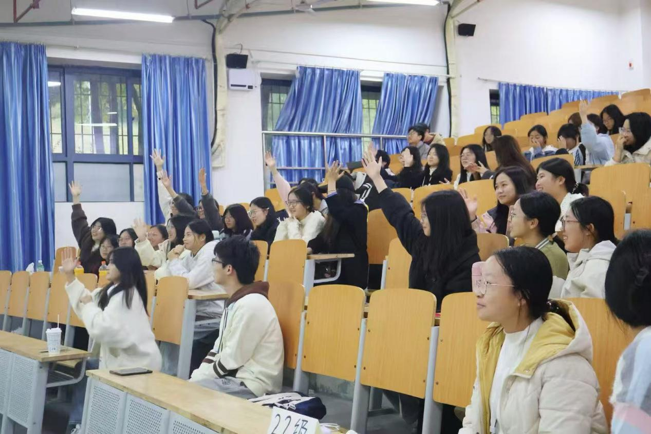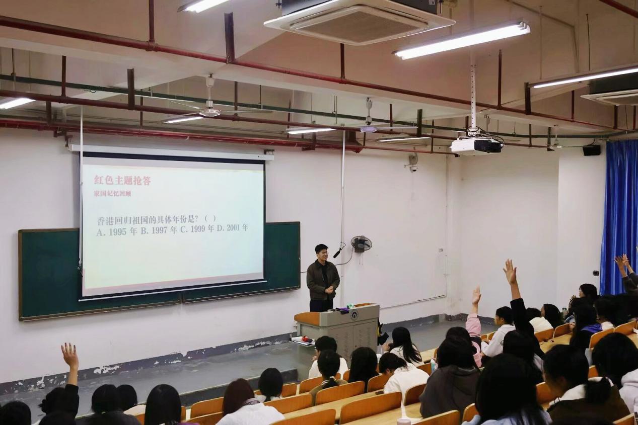 影片落幕,互动环节氛围热烈。同学们踊跃分享观影后的真实感悟,畅谈印象深刻的片段;红色主题抢答环节中,大家热情高涨、积极举手,围绕影片内容及新中国发展历史等问题展开激烈抢答,充分展现了扎实的知识储备与浓厚的爱国热情。随后,《我和我的祖国》歌曲伴奏响起,全体同学起立齐声合唱,激昂旋律将爱国氛围推向高潮。