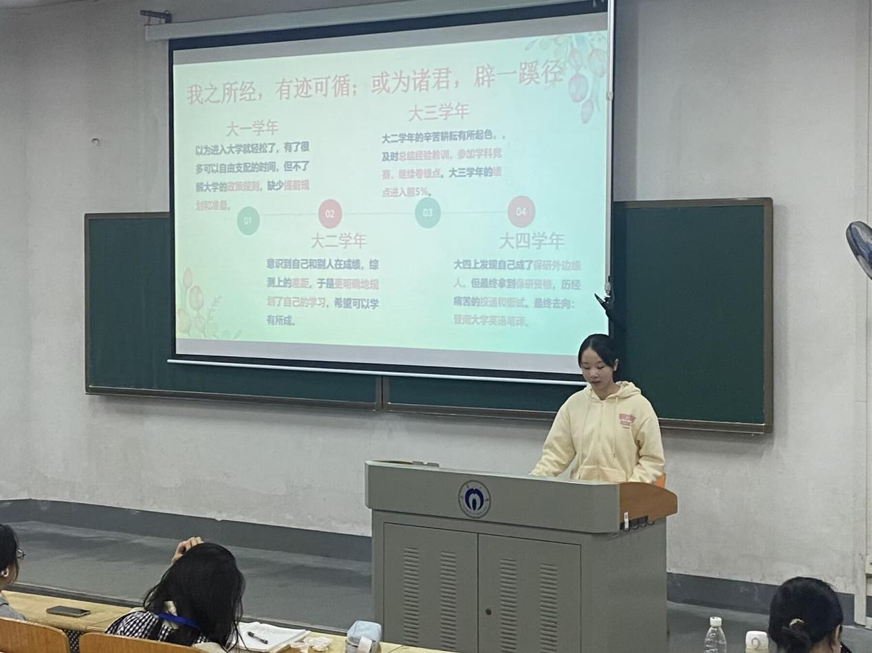随后,就能力提升方面,英语水平,科研,学科竞赛成为分享焦点。22级优秀学子们分享自身学习方法:例如通过“英美短剧”来培养语感和“影子跟读法”来提升口语,并鼓励各学子积极参与“挑战杯”、英语竞赛等赛事积累经验,希望各学子能积极参加大创项目,提高推免竞争力。他们根据自身经验,提到:“材料准备的细节同样关键”,提醒各学子成绩单,个人陈述等材料要分类整理,及时更新,减少后续整理时间,要尽量保持通讯畅通,避免遗漏重要信息。